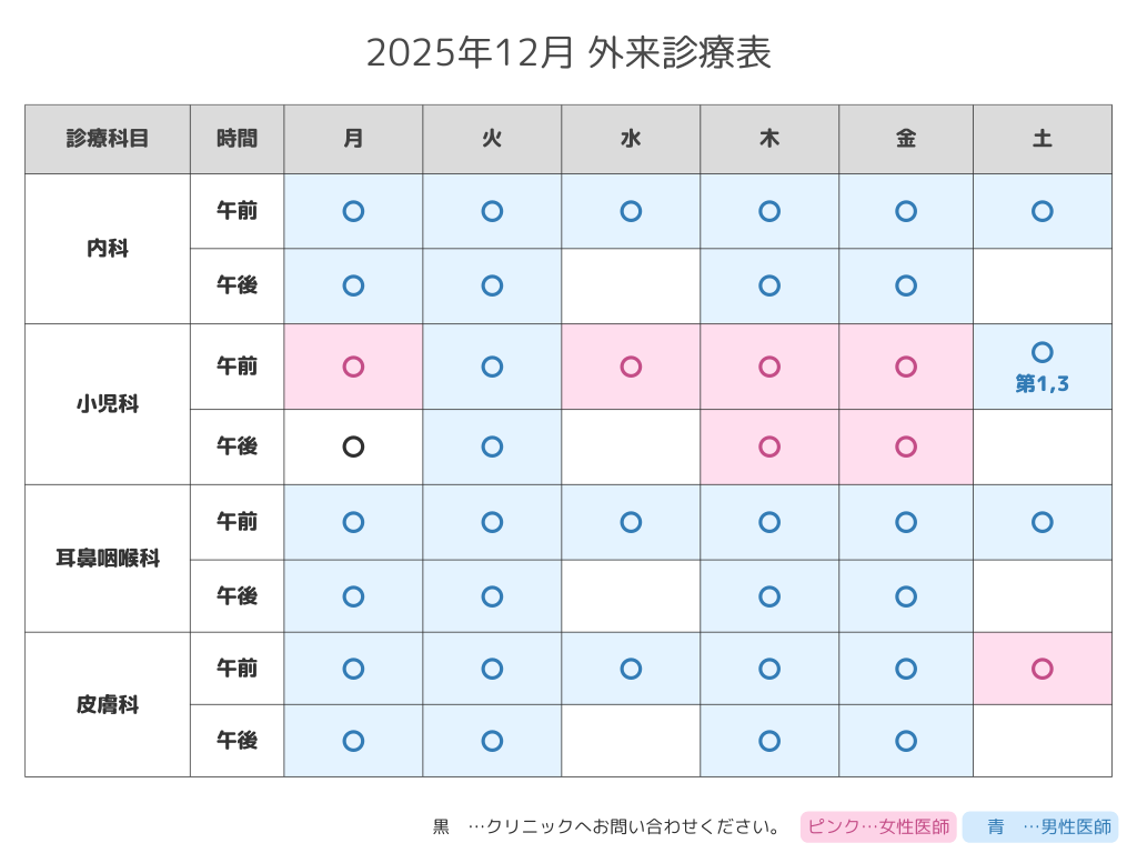 2025年12月の外来診療について 2025.11.28 現在予定されている2025年12月の外来診療情報をお知らせいたします 事情により、変更が発生する場合がございますが、変更があった際にはお知らせに掲載いたします。 何卒、よろしくお願いいたします。 ポストするシェアするLINEでシェアする WEB外来予約 準備中 発熱外来予約
