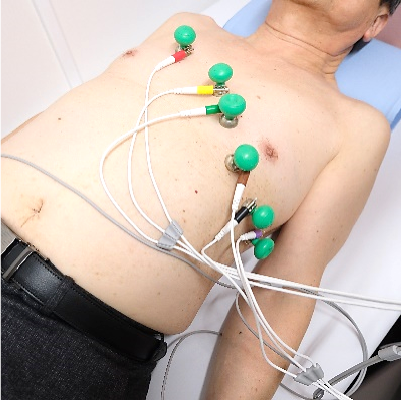 24時間にわたって日常生活の中での心電図を記録する長時間心電計を使った検査です。通常はこの検査装置の基本を作ったHolter博士の名前をとり、ホルター心電図と呼ばれています。ホルター心電図は長時間にわたって、睡眠中や運動中など日常生活の心電図が記録できるので、不整脈や狭心症の発作時の心電図をとらえることができ、症状の原因診断に役立ちます。動悸や胸の痛みや圧迫感、違和感などがある患者さんには必須の検査です。