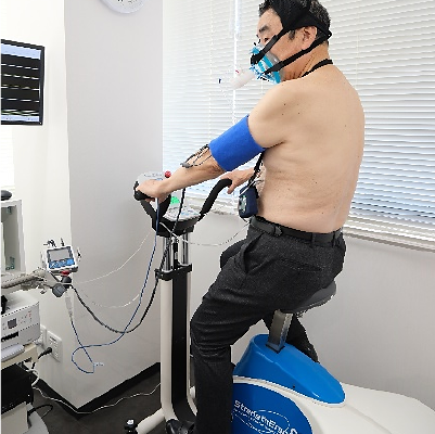 運動負荷心電図と同じように、べルトコンベア(トレッドミル)の上を歩いたり、トレッドミルの代わりにペダルが重くなる固定式自転車(バイク)を漕ぎながらできる所まで行って頂きます。運動負荷心電図検査との違いは、段階的に負荷が強くなる代わりに少しずつ連続的に負荷が増すことです。運動負荷心電図で測定される心電図、血圧に加え、血中の酸素飽和度ならびにマスクを付けて呼気(吐く息)の中の酸素と二酸化炭素の量を一息毎に測定し、最高酸素摂取量などを測定します。これは運動能力を示す最も重要な指標で、生命予後(どれだけ長生きできるか)を判断したり、健康のためやリハビリテーションで行う運動療法をどのように行ったら良いかを決めることができます(運動処方箋)。