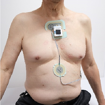 胸に5ヵ所ほど電極と小さい記録器を付けます。装着には約15分程度かかります。24時間記録しますが、検査中は運動や飲酒を含めいつも通りの生活を行ってください。じっとしていては、普段の生活の中での心電図の変化が記録できません。お風呂には入れませんので、検査日の前日に入っておいてください。電極が剥がれない程度に軽くシャワーを浴びるのは可能です。また、検査中の出来事や動悸などの症状、就寝、起床、食事、排尿、排便、飲酒などは、装着時に渡される日誌にご記入ください。絆創膏などでかぶれる人は、あらかじめ塗り薬を使う場合がありますのでお申し出ください。装着してから24時間後に外しますがかかる時間は5分程度です。結果が出るまでに1週間~10日程かかります。 -