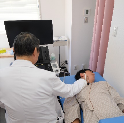 頭を少し後屈した姿勢で検査します。飲食の制限はなく約10分~15分で終わります。 -