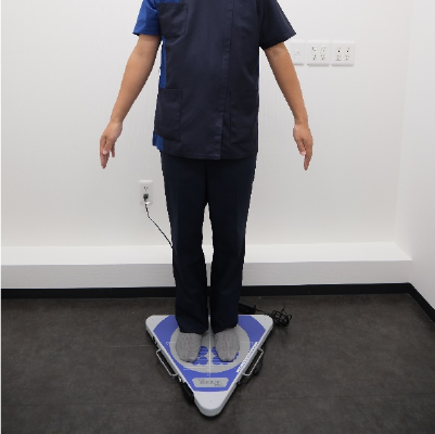 重心動揺検査:三角形の機械の上に立ち、開眼時と閉眼時で体の揺れ具合を測定比較します。